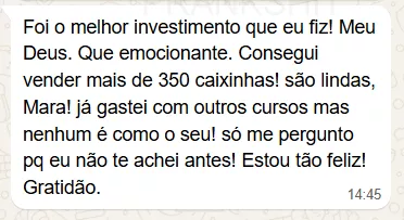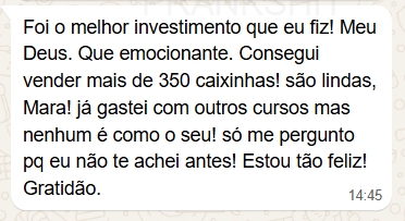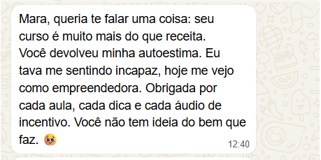 As vagas são limitadas, pois todo o suporte do curso é realizado pela própria Mara, diretamente pelo WhatsApp. Por isso, não é possível atender um número muito grande de alunas por turma.